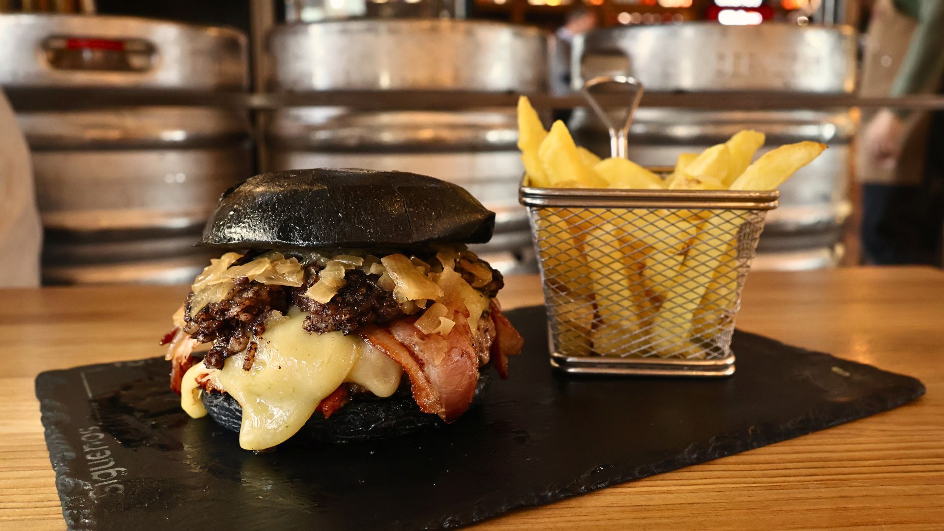 Para los amantes del queso: doble de queso de cabra, doble de queso cheddar, 220 g de carne 100% ternera, lechuga, tomate y cebolla caramelizada.