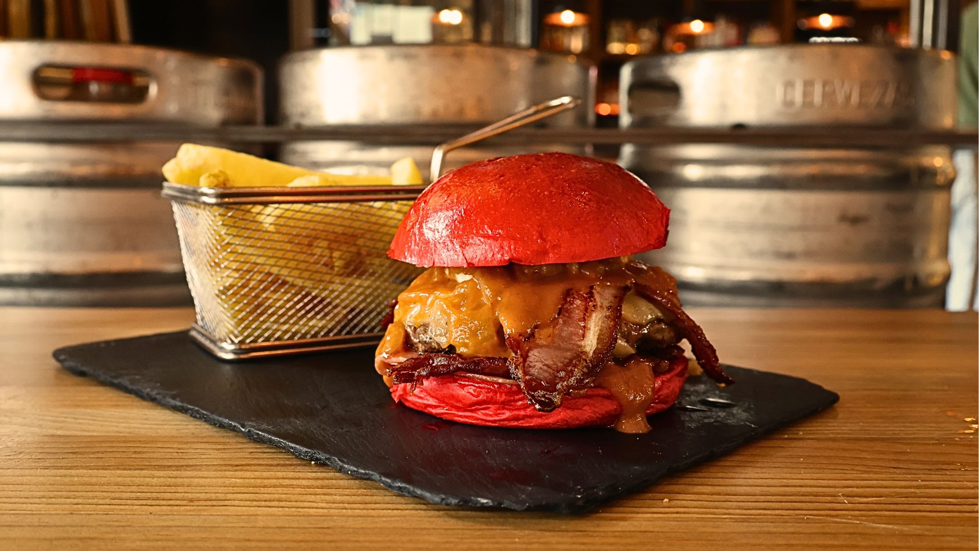 ¿Y si en una hamburguesa nos entran 4 tipos de carne? Esta es la hamburguesa para auténticos carnívoros: 220 g de carne 100% ternera, pintada de auténtica salsa brava, jamón York, jamón serrano, bacon, queso de cabra, queso cheddar y cebolla caramelizada.